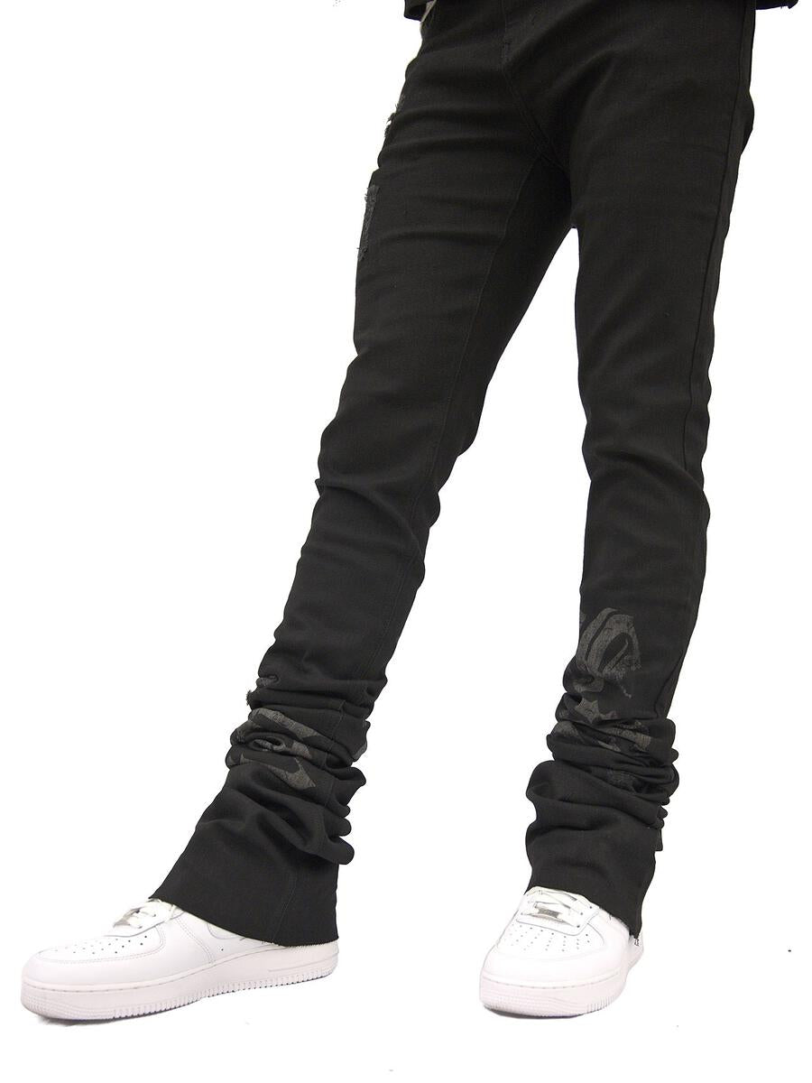 The Veux premium stretch jet black skinny super stacked jeans. Elements of artisanal deconstructions and frayed edge utility pockets decorate the style, which features extra-long inseams with flared leg openings.